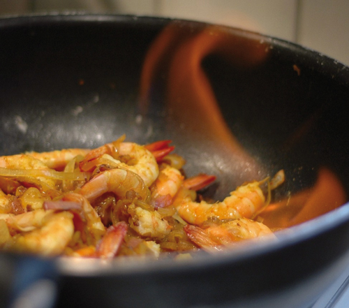 Vamos precisar de algumas gambas, uma malagueta, uma colher de chá de açafrão e igual quantidade de caril, duas nozes de manteiga e um copo de whisky.