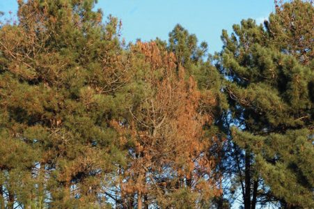 A doença surgiu em 1999 na zona de Setúbal, através de madeira contaminada, possivelmente oriunda do Oriente. Trata-se de vermes muito pequenos que se introduzem nas coníferas (pinheiros, cedros, etc…) bloqueando os canais de alimentação da planta, o que acaba por a secar.