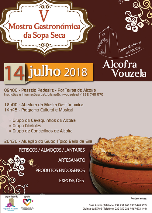 Com o apoio da Câmara Municipal de Vouzela, a Junta de Freguesia de Alcofra vai promover, no dia 14 de julho, junto à Torre Medieval de Alcofra, a V Mostra Gastronómica da Sopa Seca.